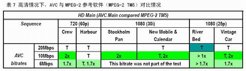 總體上講,AVC與MPEG-2對比,85個比對中66對MPEG-2的碼率要達到1.5倍才能與AVC達到同樣質(zhì)量,其中51對MPEG-2碼率要達到AVC的2倍才能達到AVC的質(zhì)量。換句話說,在60%的情況下,AVC的編碼效率能夠達到MPEG-2的兩倍。