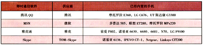 手機(jī)廠商、服務(wù)和內(nèi)容提供商都非常看好移動(dòng)即時(shí)通信市場,已經(jīng)有大量的手機(jī)內(nèi)置了主流的即時(shí)通信軟件,例如采用Windows Mobile系列操作系統(tǒng)的智能手機(jī)都預(yù)置了MSN。雅虎、騰訊在推動(dòng)其“移動(dòng)QQ”業(yè)務(wù)時(shí),也努力說服手機(jī)廠商內(nèi)置其軟件。內(nèi)置即時(shí)通信軟件的手機(jī)型號(hào)如表l所示。