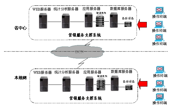 采用全省集中方式建設(shè)的營(yíng)銷服務(wù)支撐系統(tǒng)由兩臺(tái)IBM服務(wù)器形成雙機(jī)集群,安裝了數(shù)據(jù)庫(kù)服務(wù)器、WEB服務(wù)器、應(yīng)用服務(wù)器、統(tǒng)計(jì)分析服務(wù)器。