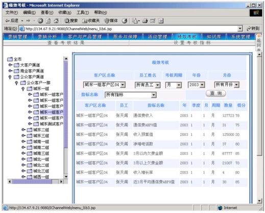 作為電信營(yíng)銷服務(wù)支撐系統(tǒng),其主要功能是支撐營(yíng)銷人員開(kāi)展?fàn)I銷活動(dòng),并通過(guò)功能完善的考核系統(tǒng)幫助各級(jí)人員進(jìn)行工作管理。本系統(tǒng)可以對(duì)KPI指標(biāo)進(jìn)行靈活的設(shè)定,可以靈活定義多種參與考核的數(shù)據(jù)來(lái)源,使得各級(jí)主管能夠?qū)蛻艚M、社區(qū)(商業(yè)客戶區(qū)、農(nóng)村統(tǒng)包區(qū))的營(yíng)銷服務(wù)工作進(jìn)行考核評(píng)分?己酥芷诳梢酝ㄟ^(guò)參數(shù)進(jìn)行設(shè)定(一般以月為單位)。