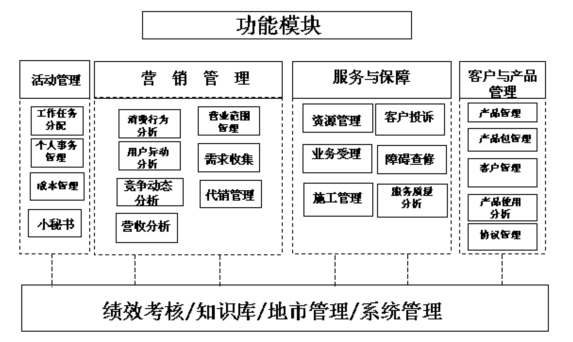 本系統(tǒng)主要有客戶與產(chǎn)品管理、營(yíng)銷管理、服務(wù)與保障、活動(dòng)管理、績(jī)效考核五大主要功能,如下圖所示。