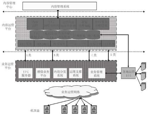 IPTV業(yè)務(wù)對(duì)系統(tǒng)運(yùn)行、管理、網(wǎng)絡(luò)的要求都非常高,因而必須采用分布式結(jié)構(gòu)來進(jìn)行部署。從部署層次來分,可分為內(nèi)容管理中心、內(nèi)容集成運(yùn)營平臺(tái)、業(yè)務(wù)支撐平臺(tái)。