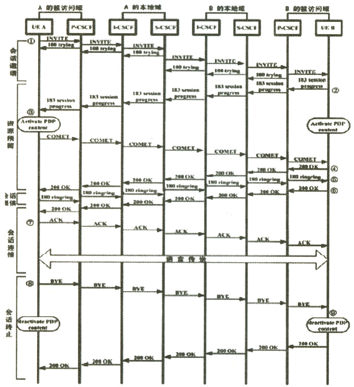 B接受了這個(gè)會(huì)話請求,但此時(shí)他不回鈴?fù)ㄖ狝,他返回183sessionprocess應(yīng)答表示他接受該會(huì)話,同時(shí)要求A對此表示確定,這個(gè)應(yīng)答通過各個(gè)CSCF傳給A。同時(shí)B激活一個(gè)GPRSPDP上下文,它被用來通過IMS的IP接入點(diǎn)來建立語音通道。