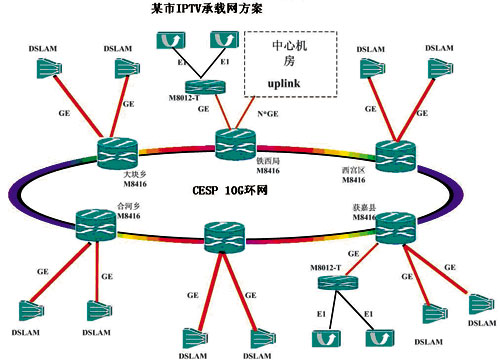 下面簡(jiǎn)單介紹一下網(wǎng)通某地市基于CESP的IPTV承載網(wǎng)方案。傳統(tǒng)的IPTV承載都是通過(guò)2.5G MSTP或RPR千兆環(huán)來(lái)傳輸流媒體數(shù)據(jù)的,其問(wèn)題在于:按照現(xiàn)有的IPTV用戶數(shù)和明年計(jì)劃發(fā)展用戶數(shù),平均每個(gè)村有近50個(gè)IPTV用戶,一般一個(gè)鄉(xiāng)要管轄30個(gè)村。按照每戶IPTV 2M的帶寬分配,一個(gè)鄉(xiāng)就需要3G的接入帶寬才能滿足業(yè)務(wù)發(fā)展的需求,而現(xiàn)有的千兆環(huán)和2.5G MSTP根本就無(wú)法滿足日益膨脹的數(shù)據(jù)業(yè)務(wù)需求。因此,亟須采用一種全新的數(shù)據(jù)承載平臺(tái)來(lái)改造現(xiàn)有的縣、鄉(xiāng)、村的數(shù)據(jù)接入網(wǎng)絡(luò)。