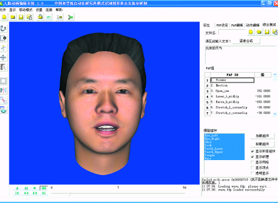 說話人頭像模塊包括語音合成、人臉動畫兩個子模塊。語音合成模塊是為了將天氣查詢獲得信息表達(dá)出來。本文中,語音合成模塊是基于中科院自動化所設(shè)計(jì)的“繪聲”語音合成系統(tǒng),該系統(tǒng)能夠?qū)⑷我廨斎氲奈谋,以連續(xù)自然的聲音朗讀出來,并能夠處理中文普通話、粵語、英語等多種語言或方言。