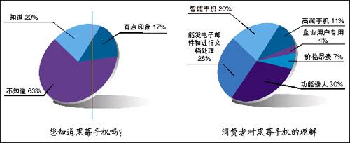 根據(jù)調(diào)查結(jié)果,目前國內(nèi)知道黑莓手機的消費者僅占20%,有63%的消費者從沒有聽說過“黑莓”這個名字,還有17%的消費者只是有點印象。