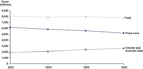 但問題是,在發(fā)達(dá)國家,用戶寬帶接入市場已經(jīng)接近飽和。正因?yàn)槭沁@樣一種情況,所以用戶數(shù)量也就很難再有增加。ARPU值在極大的競爭壓力下也很難有很大的突破。一切都靜止不動,固話收入持續(xù)下降,所以圖中的“'Internet