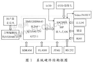 系統(tǒng)硬件主要由TI公司的TMS320DM643和三星公司的S3C2410組成。其中TMS320DM643完成音頻壓縮編解碼G.711/G.729/G.723.1和視頻壓縮編解碼H.264;S3C2410完成SIP協(xié)議和嵌入式OS及各種接口如RS232、復(fù)合視頻輸入/輸出、數(shù)字CCD攝像頭、LCD、RJ45、以太網(wǎng)、鍵盤等。音頻信號的輸入/輸出通過TI公司的TLV320AIC23送入TMS320DM643進行壓縮編碼。