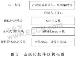 在系統(tǒng)硬件完成后,剩下的需要大量丁作來編寫代碼實現(xiàn)各個功能模塊,最終實現(xiàn)整個系統(tǒng)。系統(tǒng)的軟件結(jié)構(gòu)如圖2所示。嵌入式OS是采用ARM-Linux內(nèi)核,硬件驅(qū)動模塊主要是基于ARM 9的介于硬件和Linux內(nèi)核之間的軟件接口,為特定的硬件響應(yīng)定義好編程接口從而操作硬件,這2大模塊的技術(shù)目前已相當(dāng)成熟,相關(guān)的文獻非常多;音頻編碼采用G.711/729/723.1,是為了讓終端能適應(yīng)音頻編解碼的非對稱操作,有良好的兼容性,他可直接選用TI公司第三方提供的語音開發(fā)軟件包。本文根據(jù)視頻電話終端的特點和當(dāng)前實現(xiàn)的技術(shù)難點主要討論視頻編碼H.264和SIP協(xié)議棧2大核心技術(shù)的硬件實現(xiàn)。