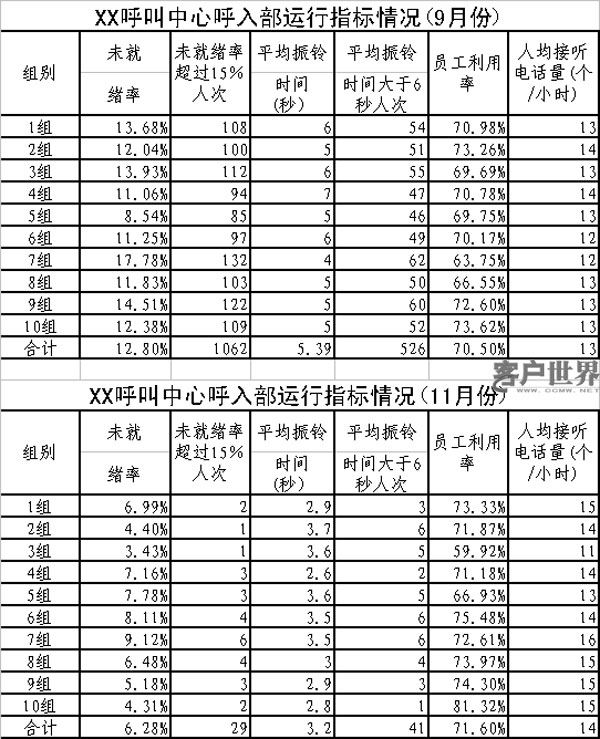 筆者所在呼叫中心從今年10月份開始實(shí)行“四率管理”,以解決現(xiàn)場(chǎng)管理工作的存在的問(wèn)題,提高現(xiàn)場(chǎng)管理水平,提高服務(wù)效率。從統(tǒng)計(jì)數(shù)據(jù)看(見(jiàn)下表),實(shí)行“四率管理”后,呼叫中心的現(xiàn)場(chǎng)管理水平得到大幅提高,服務(wù)指標(biāo)增長(zhǎng)較快。在員工利用率基本保持不變的情況下,未就緒率、平均振鈴時(shí)間、每小時(shí)接聽(tīng)電話量等指標(biāo)均得到有效改善。其中,未就緒率從9月份的12.8%降低到6.3%,未就緒率低于15%的員工人次從1062次降低到29次;平均振鈴時(shí)間從5.4秒降低到3.2秒,平均振鈴時(shí)間大于6秒的人次從526人次降低到41人次。每小時(shí)人均接聽(tīng)電話數(shù)量從13個(gè)提高到14個(gè)。按8小時(shí)工作計(jì)算,每人每天接聽(tīng)電話數(shù)量增長(zhǎng)10個(gè)左右。具體統(tǒng)計(jì)數(shù)據(jù)見(jiàn)下表。