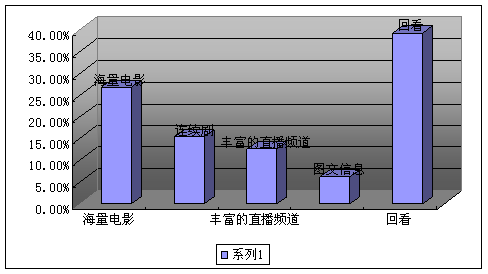 當(dāng)IPTV進(jìn)入家庭后,如何維系其可持續(xù)性,良性發(fā)展,便需要考慮用戶的使用心理,這個(gè)調(diào)查看出,內(nèi)容的豐富性和互動(dòng)的優(yōu)勢是IPTV最為用戶稱道的地方,因此,在數(shù)字電視目前還主要以頻道數(shù)量和單向?yàn)橹鞯那闆r下,如何加大這方面的優(yōu)勢,將是IPTV的立身之本。