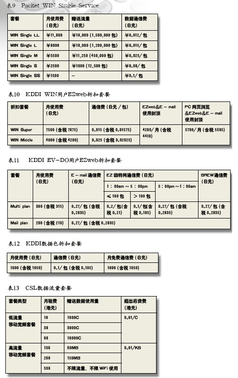 使用數(shù)據(jù)通信包折扣套餐WIN Super及WIN Middle的用戶(hù),每月只需支付固定的月租費(fèi),就可以使用與月租費(fèi)等額的數(shù)據(jù)通信服務(wù),同時(shí)享受使用EZweb和E-mail4200日元/月(含稅4410日元)封頂和使用PC網(wǎng)頁(yè)瀏覽、EZweb和E-mail5700日元/月(含稅5985日元)使用封頂?shù)恼劭蹆?yōu)惠(見(jiàn)表10)。