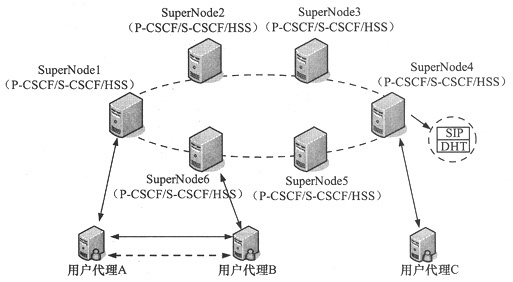 在分布式IMS架構(gòu)中,每一個(gè)SuperNode都包含兩類功能:基于DHT的HSS功能和基于SIP的會(huì)話控制功能。基于SIP的會(huì)話控制功能包括P-CSCF功能和S-CSCF功能,P-CSCF為用戶代理接入到系統(tǒng)中的入口點(diǎn),S-CSCF扮演歸屬地會(huì)話控制的角色。P-CSCF和S-CSCF的功能和3GPP