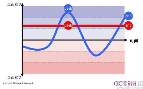 紅色情感曲線代表旨在提供全面理想體驗的傳統(tǒng)方法。藍色情感曲線反映的是一種資源分配的新方法,它專注于峰值和終了這兩個關(guān)鍵點同時將剩余子流程的表現(xiàn)控制在平均水平之下?此菩瘦^低的那個(藍色情感曲線)