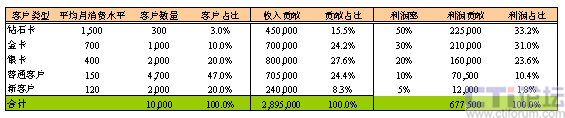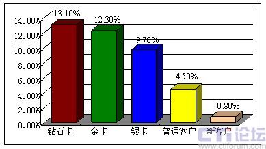 因?yàn)楦叨丝蛻粼诶麧?rùn)貢獻(xiàn)中所起的巨大作用,通過簡(jiǎn)單的計(jì)算即可得出,每一名鉆石卡客戶流失帶來的利潤(rùn)損失,相當(dāng)于9.4名銀卡客戶流失帶來的損失,或相當(dāng)于50名普通客戶流失帶來的損失,或相當(dāng)于125名新用戶流失帶來的直接損失。