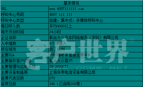 2007年秋天,聯(lián)合大眾汽車網(wǎng)絡(luò)服務(wù)(深圳)有限公司現(xiàn)代化、智能化的大型全國(guó)電話呼叫中心落成并投入使用。從投入使用至今,呼叫中心經(jīng)歷了從無(wú)到有、不完善到健全的發(fā)展歷程,聯(lián)合大眾24小時(shí)全國(guó)服務(wù)熱線現(xiàn)已成為客戶價(jià)值與公司價(jià)值之間傳遞的橋梁。