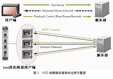 Media Server等業(yè)界常見(jiàn)的視頻服務(wù)器互通并提供性能測(cè)試。圖3是VOD服務(wù)器交換過(guò)程與IXIA進(jìn)行性能測(cè)試示意。