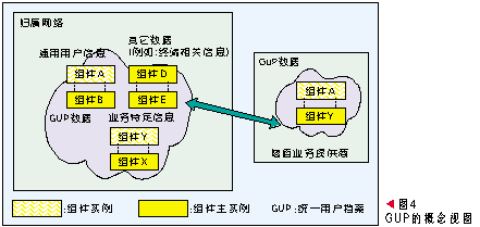 GUP中一個用戶相關(guān)的數(shù)據(jù)由多個數(shù)據(jù)組件構(gòu)成,每個組件又可以包含多個數(shù)據(jù)單元。在網(wǎng)絡(luò)中用戶數(shù)據(jù)每個數(shù)據(jù)組件只有一個主實例,但是可以有多個復(fù)制實例。用戶數(shù)據(jù)以組件為單元可以存放在不同的網(wǎng)絡(luò)實體中,應(yīng)用可以通過統(tǒng)一的訪問入口以標(biāo)準(zhǔn)接口訪問所有授權(quán)的數(shù)據(jù),這個入口功能由GUP