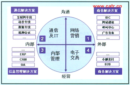 企業(yè)客戶對電信服務的需求,集中體現(xiàn)為實現(xiàn)企業(yè)商業(yè)過程的綜合通信信息整體服務,具體可以按縱向溝通、經(jīng)營和橫向內(nèi)部、外部分為四部分:內(nèi)部員工溝通、內(nèi)部經(jīng)營管理、外部客戶營銷以及產(chǎn)品銷售實現(xiàn)。與之相對應的需求如圖2所示。