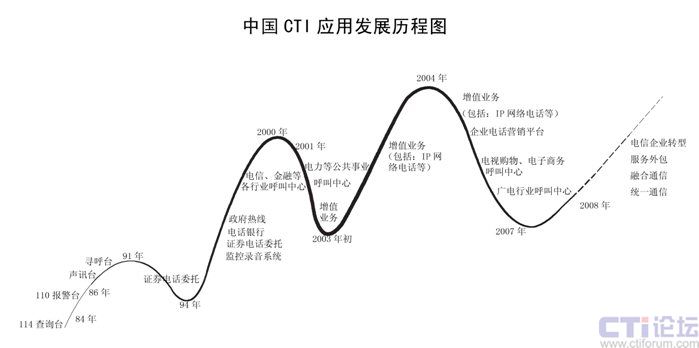 CTI在中國(guó)已經(jīng)發(fā)展了二十多年,已經(jīng)從最早的電信行業(yè)CTI應(yīng)用發(fā)展到金融(包括銀行、保險(xiǎn)、證劵及基金)、電力、郵政、企業(yè)(包括煙草、汽車、家電、IT、互聯(lián)網(wǎng)、旅游、報(bào)業(yè)、航空、物流、醫(yī)療、公共事業(yè)等)、政府、軍隊(duì)等各行各業(yè)的應(yīng)用。特別在1995年到2001時(shí)期,是CTI應(yīng)用發(fā)展最快,普及面最廣的時(shí)期,也是CTI市場(chǎng)進(jìn)入了第二次高潮;從2002開(kāi)始增值業(yè)務(wù)是整個(gè)CTI行業(yè)的突破口,整個(gè)行業(yè)以增值業(yè)務(wù)為主,CTI市場(chǎng)進(jìn)入了第三次高潮;從2006年開(kāi)始,增值業(yè)務(wù)進(jìn)入了衰退期,整個(gè)CTI行業(yè)市場(chǎng)出現(xiàn)了嚴(yán)重的危機(jī),加上新的技術(shù)出現(xiàn),技術(shù)的換代,對(duì)原來(lái)的傳統(tǒng)語(yǔ)音產(chǎn)品和公司是個(gè)致命的打擊。