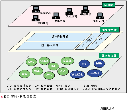 NGSN是為了適應(yīng)網(wǎng)絡(luò)和技術(shù)的融合趨勢、運營商轉(zhuǎn)型的需求提出的,通過整合各種網(wǎng)絡(luò)業(yè)務(wù)能力,實現(xiàn)數(shù)據(jù)、業(yè)務(wù)、能力和管理的統(tǒng)一,從而能夠快速提供各種增值業(yè)務(wù)、協(xié)助運營商在價值鏈中處于主導地位。其概念層次如圖2所示。