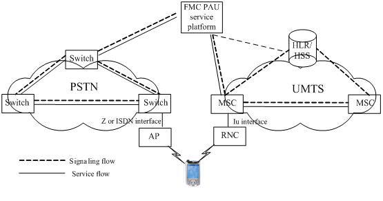 在FMC-PAU中,移動(dòng)終端屬于雙;蚨嗄=K端,用戶使用該終端既可以接入到3G移動(dòng)網(wǎng),也可以采用無(wú)線方式通過接入節(jié)點(diǎn)(AP)接入到PSTN網(wǎng)絡(luò)中。