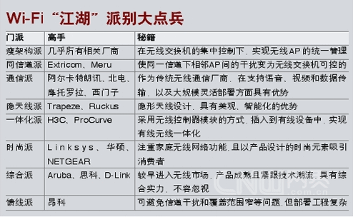 少林、武當、華山、峨嵋、丐幫……眾多門派共同支撐起了武俠小說當中的“江湖”。而在無線網(wǎng)絡的“江湖”上,其實也存在著很多門派:比如瘦架構(gòu)派、同信道派、一體化派、通信派、隱天線派、時尚派等,各家廠商都有自己的看家本事,在極大豐富了無線產(chǎn)品,更好滿足了用戶需求的同時,也促進了無線技術在多個層面上的深入發(fā)展。