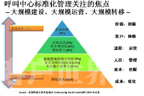 那么,對(duì)于這個(gè)尚處在”嬰兒潮”時(shí)期的產(chǎn)業(yè),我們最應(yīng)該做些什么來呵護(hù)和培育這個(gè)產(chǎn)業(yè)健康有序的發(fā)展?大家要好好呵護(hù)這個(gè)行業(yè)。如果只是強(qiáng)調(diào)“要想讓呼叫中心發(fā)展,那就需要我們多投錢,這樣就能買許多機(jī)器,放在公司里面。規(guī)格有了,那呼叫中心就發(fā)展了。”我覺得這樣的說法是對(duì)呼叫中心發(fā)展的錯(cuò)誤理解。我們這個(gè)標(biāo)準(zhǔn)是希望營(yíng)建專業(yè)化的產(chǎn)業(yè),整個(gè)呼叫中心產(chǎn)業(yè)的價(jià)值金字塔,這個(gè)金字塔每年在美國(guó)有一個(gè)專場(chǎng),就叫呼叫中心專場(chǎng),標(biāo)志一個(gè)產(chǎn)業(yè)成熟的金字塔是怎樣的。通過調(diào)查發(fā)現(xiàn),當(dāng)產(chǎn)業(yè)進(jìn)入成熟階段,標(biāo)準(zhǔn)化服務(wù)的第一個(gè)就是降低成本,也就是提高生產(chǎn)效益,能夠把這個(gè)產(chǎn)業(yè)細(xì)化分解,高度的模塊化進(jìn)行精細(xì)控制的時(shí)候,其他的差異化的體現(xiàn)。呼叫中心本身是不是成為企業(yè)核心競(jìng)爭(zhēng)力的一部分,或者說越來越成熟的外包商出現(xiàn),能夠把一些企業(yè)非核心競(jìng)爭(zhēng)力加入到自己的核心競(jìng)爭(zhēng)力之上,這叫專業(yè)化。還有一個(gè)更加靈活可控的成本,呼叫中心的彈性從一百人到一千人,一千人到三千人的發(fā)展更加可控。還有獲得特殊技能與知識(shí),事實(shí)上呼叫中心各行各業(yè)知識(shí)都會(huì)接觸,你只有專著才能做得更好,本身對(duì)于呼叫中心的從業(yè)人員來說,在這個(gè)產(chǎn)業(yè)中扮演的角色不是締造一個(gè)企業(yè)的核心競(jìng)爭(zhēng)力,怎么期望從業(yè)人員掌握更多的技能和知識(shí),來指導(dǎo)更多的行業(yè)和企業(yè)。特別是在客戶導(dǎo)向上面的發(fā)展,還有在金字塔上面增加收入,分析客戶所需,讓我們更好的滿足客戶的需求;然后資本費(fèi)用化,從外包專業(yè)化領(lǐng)域帶來的變化,很多的時(shí)候最大的一筆建設(shè)是呼叫中心,基本一個(gè)中等的呼叫中心沒有500萬以上的資金投入是不可想象的。