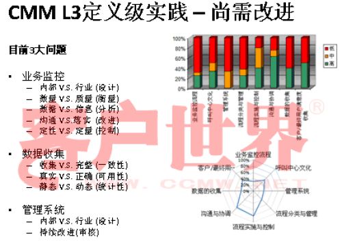 接下來我用一個(gè)很小的案例結(jié)束今天的分享,我們整個(gè)的呼叫中心的成熟度模型目前是在電信行業(yè)開始了2008年版的推廣,成熟度模型經(jīng)歷從07年成立亞太呼叫中心產(chǎn)業(yè)聯(lián)盟以后,由一群這個(gè)行業(yè)里面的專家,特別是中國(guó)產(chǎn)業(yè)市場(chǎng)的發(fā)展建立起的標(biāo)準(zhǔn),一年以來在通信行業(yè)我們做的能力成熟度的判定有一些很有意思的啟示,通信行業(yè)占到我們整個(gè)呼叫中心產(chǎn)業(yè)約70%的坐席,是最大的、最有代表性的產(chǎn)業(yè)。做下來真的很有代表性,普遍性在于環(huán)境建設(shè)、資產(chǎn)投入、資產(chǎn)配置,所以這下面的雷達(dá)就可以看到,相對(duì)完善都是在環(huán)境建設(shè),功能區(qū)建設(shè),整體空間設(shè)計(jì)、硬件相對(duì)來說比較偏硬的一些。在其他方面偏廢的比較厲害。第二個(gè)雷達(dá)在一些獎(jiǎng)懲管理、信息管理,整個(gè)軟性方面幾乎有很濃重的一些計(jì)劃經(jīng)濟(jì),制造行業(yè)的一些領(lǐng)域相對(duì)來說比較成熟。我們目前看到的,基本上通信行業(yè)的一些發(fā)展在能力成熟度上是二級(jí)到四級(jí),尤其以二到三級(jí)的發(fā)展更為普遍。通常的方法為期一周的標(biāo)桿調(diào)研,看所有的呼叫中心發(fā)展的五個(gè)方面,我們才會(huì)在里面做這樣的判定。在能力成熟度的三級(jí),我們做了一些企業(yè)發(fā)現(xiàn),特別在三級(jí),關(guān)于能不能對(duì)流程進(jìn)行一致性管理方面,就是剛才李老師講到的不是最急的,而管理是最重要的?赡芩械牧鞒潭喽嗌偕儆幸恍┏墒於鹊膯栴},但是我們的源頭流程能力在三個(gè)方面有很大的差距:一個(gè)是業(yè)務(wù)監(jiān)控流程,第二個(gè)數(shù)據(jù)收集流程,還有一個(gè)是管理系統(tǒng)的審核流程。這個(gè)大家可以和自己的呼叫中心比一比。