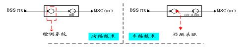目前在GSM網(wǎng)信令檢測領域,主要應用的措施有跨接技術、串接技術兩種。其圖示如下:
