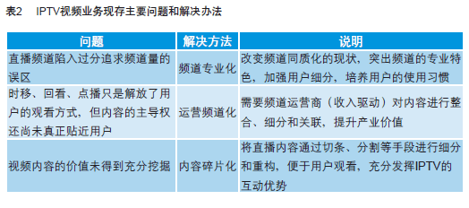 IPTV發(fā)展中,傳統(tǒng)視頻業(yè)務(wù)既是切入點(diǎn),也是業(yè)務(wù)收入的重要來源。但目前視頻業(yè)務(wù)的價(jià)值還未得到充分體現(xiàn),互動(dòng)性優(yōu)勢還未得到充分挖掘。主要問題和解決辦法如表2所示。