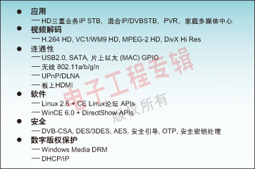H.264、WM9、AVS的STB810平臺和用于HD H.264 a和VC1的STB225平臺。IP-STB平臺應(yīng)該提供一個驗證核技術(shù),例如NXP公司基于Nexperia技術(shù)的平臺,并且每一個研發(fā)工具都向后兼容。