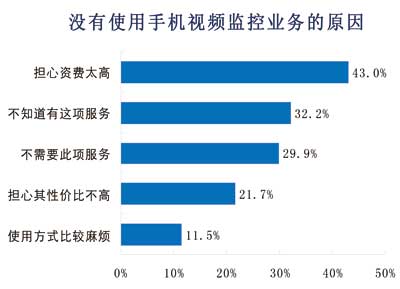 諾達(dá)咨詢對沒有使用手機(jī)視頻監(jiān)控的用戶原因進(jìn)行調(diào)查,結(jié)果表明,43%的用戶擔(dān)心資費(fèi)太高,其次對手機(jī)監(jiān)控不了解和不需要此項(xiàng)服務(wù)的用戶各占32%、30%。22%的用戶擔(dān)心性價(jià)比不高,12%用戶因?yàn)槭褂帽容^麻煩而不選擇手機(jī)視頻監(jiān)控服務(wù)。