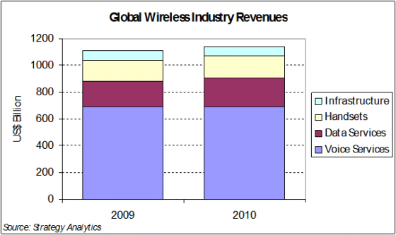 2009年全球移動產(chǎn)業(yè)總規(guī)模(包括服務(wù),網(wǎng)絡(luò)設(shè)備和終端)跟上年持平。Strategy Analytics預(yù)計, 2010年全球產(chǎn)業(yè)規(guī)模將有2.8%的小幅增長,達到1.14萬億美元。