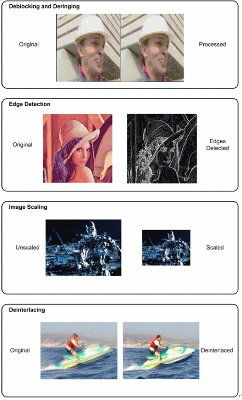 圖: 四種后處理算法示例:解塊和去振鈴、邊界檢測(cè)、圖像縮放和解交織。