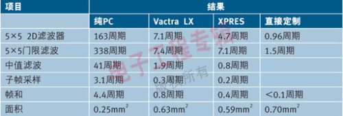 表1中“XPRES”列所示為采用Tensilica自動(dòng)化工具XPRES定制的處理器執(zhí)行5種算法的性能。