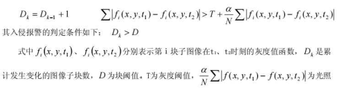 敏感項,α為抑制系數(shù),N為檢測區(qū)域內(nèi)的像素數(shù)目。采用這種塊比較法,閾值取值范圍大大減小,易于確定,而且對運動目標(biāo)的大小也有一定的選擇性。在檢測每一子塊圖像是否發(fā)生變化時,引入光照敏感項,避免了因光照變化引起的虛警。這種方法對光線變化有一定的自適應(yīng)性,擴(kuò)展了系統(tǒng)的動態(tài)適用范圍。