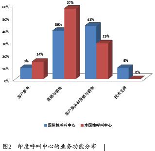 印度的呼叫中心可分為兩類:一類面向國際市場,另一類服務(wù)本國市場。如班加羅爾等6個(gè)城市的60家呼叫中心中,74%(44家)專門服務(wù)于國際市場,26%(16家)服務(wù)于本國市場。