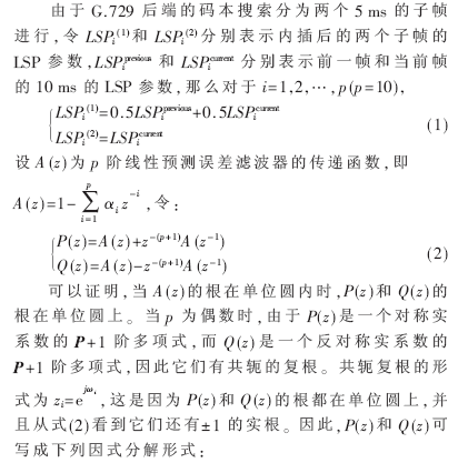 G.729的編碼過程如下:輸入8 kHz采樣的數(shù)字語音信號先經(jīng)過高通濾波預處理,每10 ms幀作一次線性預測分析,計算10階線性預測濾波器系數(shù),然后把這些系數(shù)轉(zhuǎn)換為線譜對(LSP)參數(shù),采用兩級矢量量化技術(shù)進行量化。自適應(yīng)碼本搜索時,以原始語音與合成語音的誤差知覺加權(quán)最小為測度進行搜索。固定碼本采用代數(shù)碼本機構(gòu)。激勵參數(shù)(自適應(yīng)碼本和固定碼本參數(shù))每個子幀(5 ms,40個樣點)確定一次。