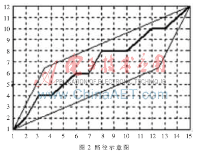 把測試模版的各個幀號n=1,…,N在一個二維直角坐標系的橫軸上標出,把參考模版的各幀號m=1,…,M在縱軸上標出,通過這些表示幀號的整數(shù)坐標畫出的橫縱線即可形成一個網(wǎng)格,網(wǎng)格中的每一個交叉點(n,m)表示測試模版中某一幀與訓練模版中某一幀的交叉點。動態(tài)規(guī)劃算法可以歸結(jié)為尋找一條通過此網(wǎng)格中若干格點的路徑,路徑通過的格點即為測試和參考模版中距離計算的幀號。