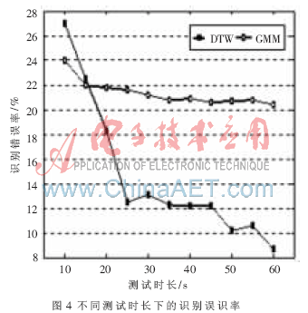 圖4給出基于DTW識別方法與GMM模型(混元數(shù)64)識別G.729編碼方案863語料庫的文本相關(guān)說話人的誤識率對比圖。橫坐標代表的測試語音的時長,縱坐標代表識別誤識率。由實驗結(jié)果可知在文本相關(guān)的說話人識別中,基于DTW算法的識別率在絕大多數(shù)情況下高于GMM模型,且隨著測試語音的增長,優(yōu)勢更明顯。