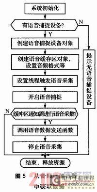 從音頻編解碼器中獲取數(shù)據(jù)時(shí),首先通過UDA1341TS采集語音信號(hào)放入語音捕捉緩存區(qū),應(yīng)用程序再從語音捕捉緩沖獲取語音信號(hào)并發(fā)送。具體程序流程如圖5所示。