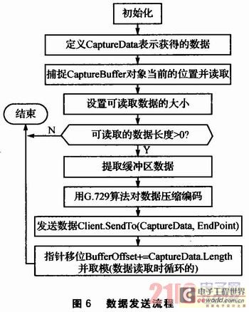 數(shù)據(jù)發(fā)送函數(shù)的作用是將語音捕捉緩沖區(qū)的數(shù)據(jù)通過Client.SendTo(CaptureData,EndPoint)函數(shù)發(fā)送到網(wǎng)絡(luò)上。當(dāng)線程發(fā)現(xiàn)有數(shù)據(jù)要讀取(即線程被觸發(fā))時(shí),就會(huì)循環(huán)調(diào)用數(shù)據(jù)發(fā)送函數(shù),直到?jīng)]有可讀的數(shù)據(jù)為止。CaptureBuffer為語音捕捉緩沖區(qū)對(duì)象。數(shù)據(jù)發(fā)送流程如圖6所示。