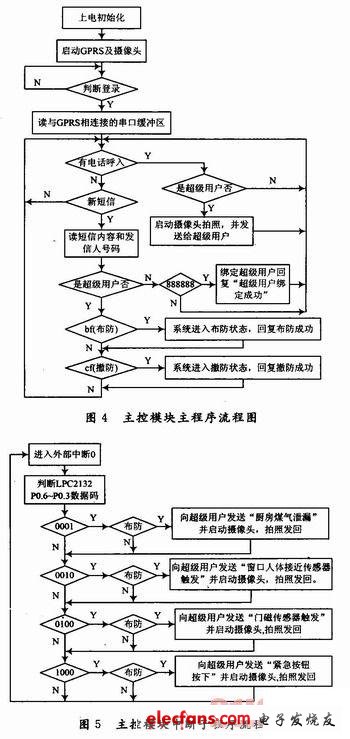 在主控模塊主程序中系統(tǒng)一直在檢測是否有來電和新短信信息,當有來電時系統(tǒng)會自動掛斷電話,然后判斷是不是超級用戶:是,啟動攝像頭拍照,并發(fā)送給超級用戶;不是,系統(tǒng)將不理睬,繼續(xù)檢測。當是短消息時,判斷是否是超級用戶:不是,判斷短信內容是“888888 ”否,是則系統(tǒng)綁定該號碼為超級用戶,并回復“超級用戶綁定成功”;是,判斷短信內容是否是“bf”或“cf”,是“bf”系統(tǒng)進入布防狀態(tài),并回復“布防成功”,是“cf”系統(tǒng)撤防,回復“撤防成功”。