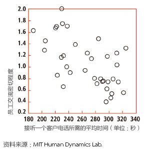 去年,彭特蘭的實驗室與美國銀行(Bank of America)設(shè)在羅得島(Rhode Island)的呼叫中心合作,在80 名中心員工身上安裝了社會傳感器。這種傳感器看起來像一枚不顯眼的徽章,使用藍牙和紅外信號監(jiān)測實驗對象每分鐘與哪些同事交談。測試活動先開展了一個月,后來又進行了6周。第一個月后,實驗室的研究人員發(fā)現(xiàn),與更多同事進行過交談的員工能夠更快地接通電話,他們自我感覺的壓力也相對較小,而客戶滿意度卻與其他人一樣高。與刻板地遵循員工手冊或服從經(jīng)理的電子郵件指示相比,通過非正式的閑聊來交流問題和解決方案似乎能取得更好的結(jié)果。有了這種結(jié)論之后,該呼叫中心嘗試盡量將員工的休息時間安排在一起,而非像過去那樣錯開。這樣員工就有了更多的時間參與閑聊。幾個月后,美國銀行向?qū)嶒炇覉蟾媪私Y(jié)果:該呼叫中心獲得了相當(dāng)于每年1,500 萬美元的生產(chǎn)力提升。
