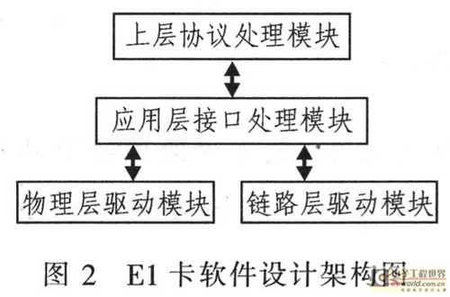 E1采集卡軟件設(shè)計架構(gòu)主要由鏈路層驅(qū)動模塊、物理層驅(qū)動模塊、應(yīng)用層接口處理模塊和上層協(xié)議處理模塊組成,如圖2所示。驅(qū)動程序是數(shù)據(jù)采集卡的基礎(chǔ),它負責(zé)E1接口數(shù)據(jù)采集和數(shù)據(jù)重組,并通過共享內(nèi)存與PC機實現(xiàn)數(shù)據(jù)交互,以及控制指令動作和硬件狀態(tài)報告等。