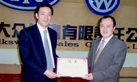向一汽-大眾客服中心部長(zhǎng)石濤(右)頒發(fā)“副主任委員”聘書(shū)