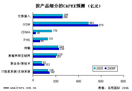 易觀國際預(yù)測2006年全國電信運(yùn)營商的資本總開支為2053億(不包括 3G 資本開支),比2005年下降1%。總的看來,運(yùn)營商在
