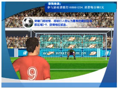 《單挑足球射門II》是我公司根據(jù)世界杯的一些特點(diǎn)、特色重新開發(fā)的一款實(shí)時(shí)游戲。由電視臺(tái)、網(wǎng)站與電信運(yùn)營(yíng)商聯(lián)合經(jīng)營(yíng)的電信增值業(yè)務(wù),由電視臺(tái)提供頻道向電視觀眾播出游戲畫面(含圖像和聲音),電信運(yùn)營(yíng)商提供電話線路和短信通道,參與者通過(guò)固定電話、小靈通和手機(jī)參與游戲,運(yùn)營(yíng)方通過(guò)收取固定電話、小靈通和手機(jī)的信息費(fèi)實(shí)現(xiàn)盈利。