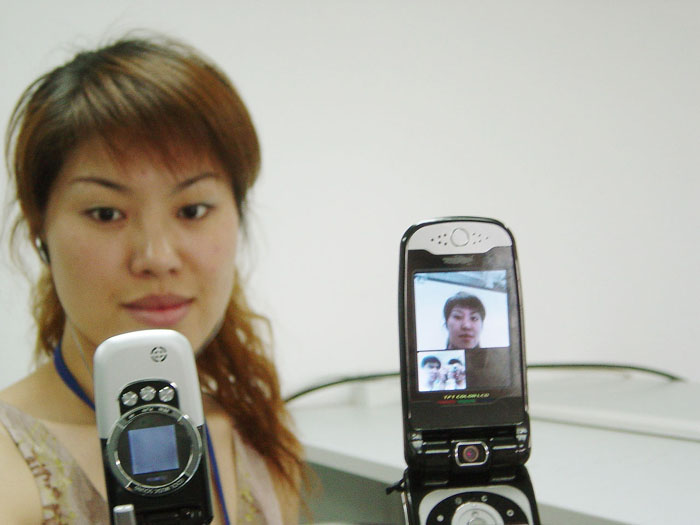 可視電話作為體現(xiàn) 3G 優(yōu)勢(shì)的典型業(yè)務(wù),必將成為 3G 的殺手級(jí)應(yīng)用。其類似目前的網(wǎng)絡(luò)視頻,通話雙方均可通過可視電話功能在手機(jī)屏幕上看到彼此的通話場(chǎng)景,但畫面較網(wǎng)絡(luò)視頻更為流暢、清晰。(圖為基于展訊 SC8800 系列芯片平臺(tái)的可視電話手機(jī)通話中,大圖為對(duì)方場(chǎng)景,小圖為自身場(chǎng)景)據(jù)展訊通信 CTO 陳大同博士介紹,早在3月初,展訊 SC8800 系列芯片平臺(tái)就已實(shí)現(xiàn)了雙向同步視音頻傳輸業(yè)務(wù),在此基礎(chǔ)上又經(jīng)過2個(gè)月的調(diào)試,直至該解決方案完全成熟,通話畫面穩(wěn)定、清晰、流暢,展訊才正式將其推入市場(chǎng)。毋庸置疑,這樣的應(yīng)用方案必將為其客戶的終端產(chǎn)品帶來更多的市場(chǎng)競(jìng)爭(zhēng)力。
